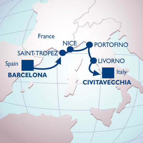 Itinerary: Barcelona, St. Tropez (overnight), Nice (overnight), Portofino, Florence/Pisa, Rome